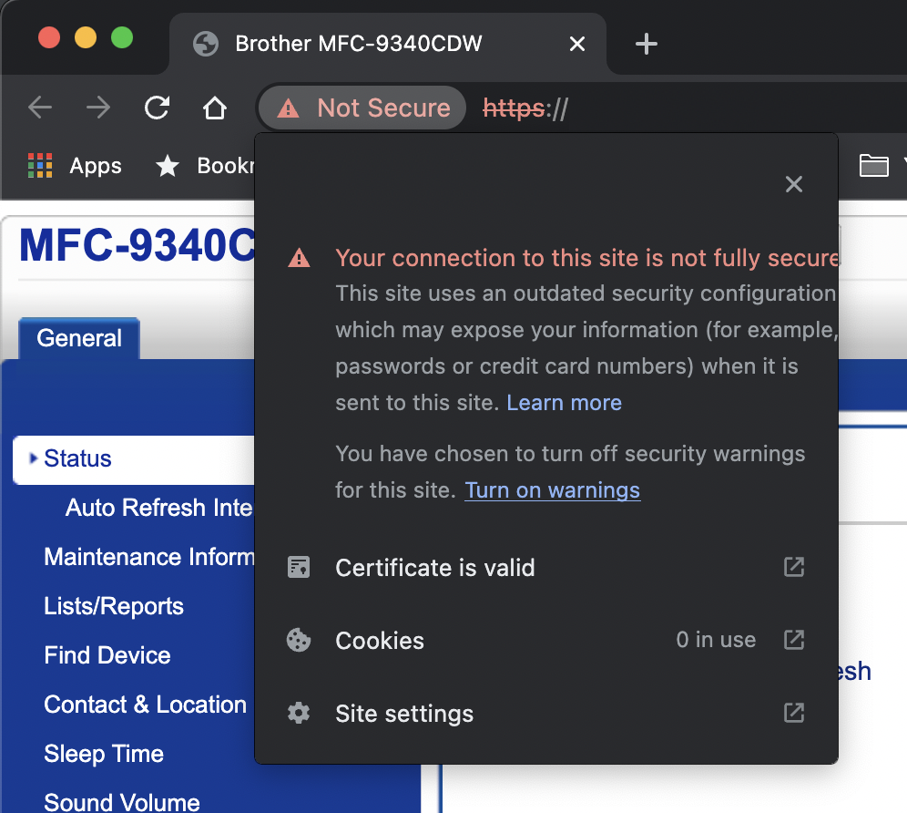 PROBLEM: Chrome deprecated TLS versions 1.0 and 1.1, so now the Brother printer web UI is not reachable from Chrome 88 and newer.