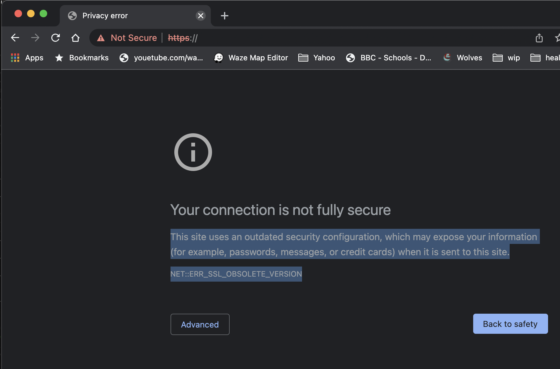 "Your site is not fully secure. The site uses an outdated security configuration, which may expose your information