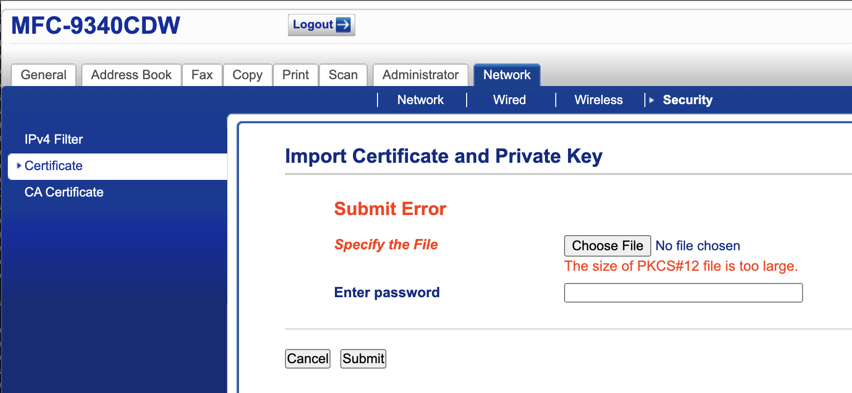 [Certificate and Private Key Import error] It seems this produces a .p12 file that the printer does not like. When importing the certificate and private key, the Brother printer gives the following Submit Error: