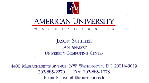 My first full time position was at The American University. Here I worked as a LAN analyst. It was at AU where I first really came to understand TCP/IP, subnetting, LAN design, and LAN troubleshooting. I had a very hands on job that allowed for installing new multi-mode fiber links, designing and deployiong new building networks, router and concentrator configuration, and Novell NetWare administration. In fact AU was Novell's test ground for NetWare 4.0 and the NDS. I had a very intamate relationship with the AU network, and sometimes miss the hands on aspect of operating that network. |