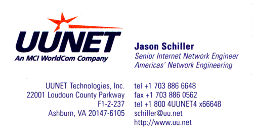 From 1998 to 2011, I worked at UUNET (WorldCom / MCI / Verizon Business) as a network engineer. At UUNET I have had a chance to not only learn routing protocols such as IS-IS and BGP, but to understand how they function and scale in one of the largest and most rigorously Engineered IP networks in the industry. They have a large test lab where I have had a chance to test everything from new hardware, to new features, as well as completing proof of concept tests for new possible network designs. UUNET was an exciting environment where I not only played with cutting edge technology, but also worked with vendors to define and deliver what features are important to our network. |